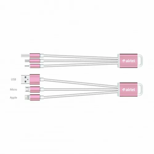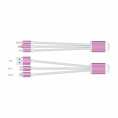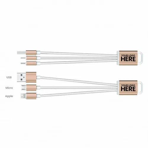 The perfect companion to the stylish tech enthusiast. With the elegant metallic design and durable braided cables this charging cable adds elegance to utility and can be engraved for a subtle refined style or imprinted with color to give your client's logo pop! The cable includes USB, MicroUSB, and 8-pin style tip to cover most Android and other devices.