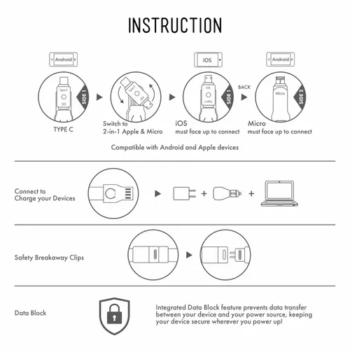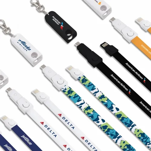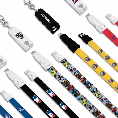 This breakaway lanyard cable charges all Smart Phones with it's Type-C tip and combo tip for 8-pin style and Micro-USB charging. Fashionable and Convenient with nice full-color branding area on the fabric strap. Simply detach the key chain clip and the lanyard to become a 3-foot charging cable. Full-color print available to clearly display a client's logo. NOTE: Badge holder is not included.