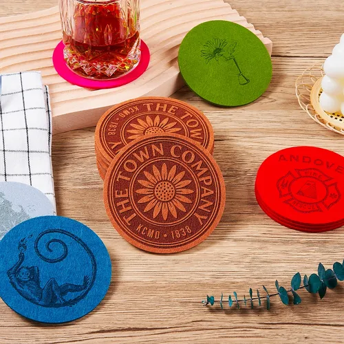 Felt is a superb element for several crafts, and it's ideal for coasters because of its softness and thickness. Unlike tiles or stones, it doesn't make a noise. It also protects surfaces from moisture by absorbing it, preventing water stains or deformation. Felt coasters safeguard all surfaces from excessive heat due to their insulating characteristics. However, LOGO can only be monochrome, with the bump feeling engraved using a laser, which doesn’t affect its overall high-end appeal.