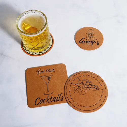 Kraft paper or kraft is paper or paperboard (cardboard) produced from chemical pulp produced in the kraft process. This coaster can be printed in full color (including photos, landscapes, and wedding images) and restore the required LOGO in full bloom. This coaster can also be customized in shape, making the form you need come true and making your LOGO more conspicuous and unique.