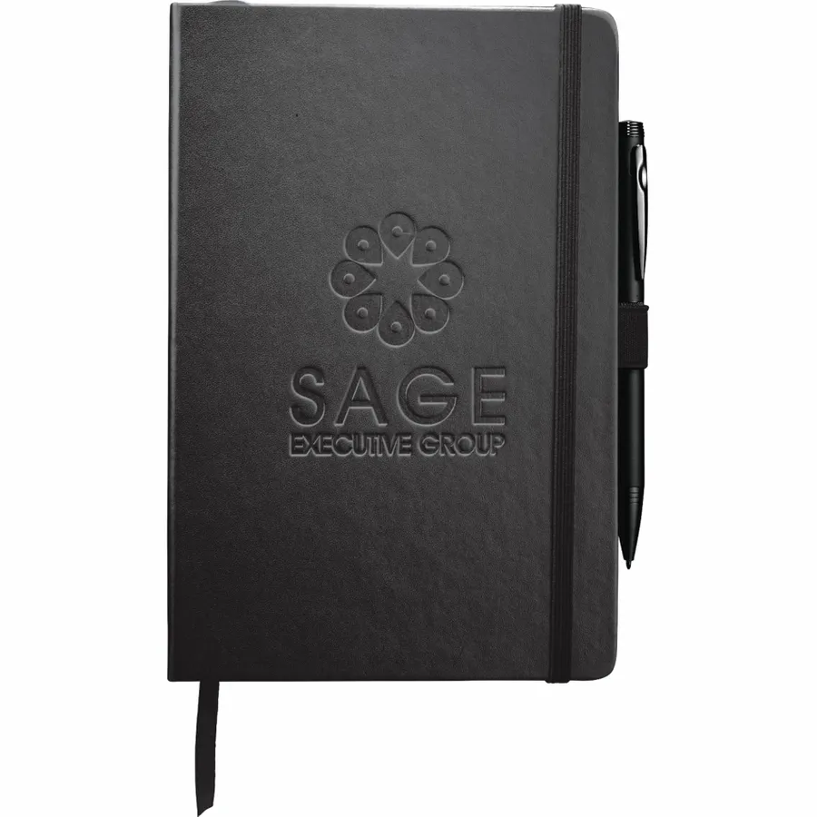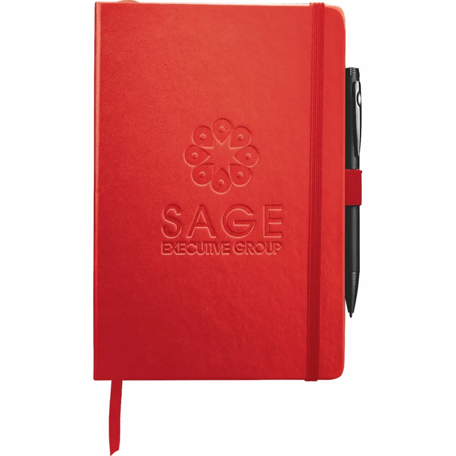 The 5.5 x 8.5 FSC Mix Nova Bound Journal features a faux leather like, hard cover with built-in elastic closure, ribbon page marker, and expandable accordion pocket. Includes 96 sheets of lined white FSC Mix paper. Pen is not included.