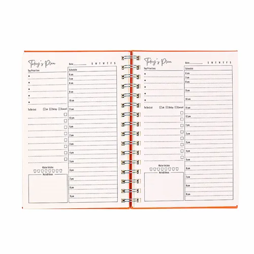 A custom planner is a personalized organizer where you can choose the cover layout style, size, and even add your logo, name, or unique artwork. It’s tailored to your preferences or brand identity.