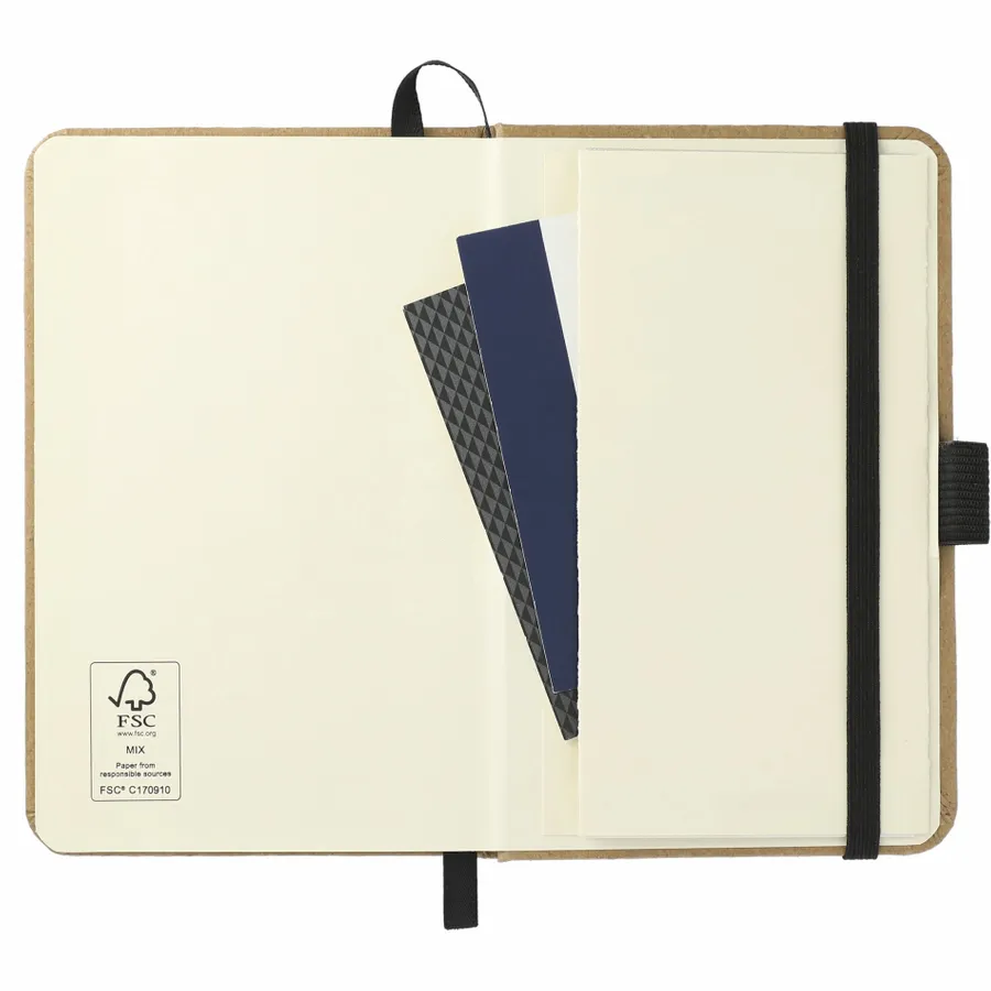 The 3.5 x 5.5 FSC Mix Pocket Bound Journal features a FSC Mix paper, hard cover. 80 sheets of cream FSC-certified lined pages. It also features an elastic closure, ribbon page marker, elastic pen loop and back document pocket. And through a partnership with 1% For The Planet, one percent of sales of all EcoSmart products are donated to environmental nonprofits. Due to the natural of this material, the imprint and cover material color will vary.