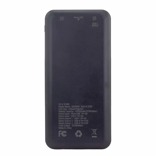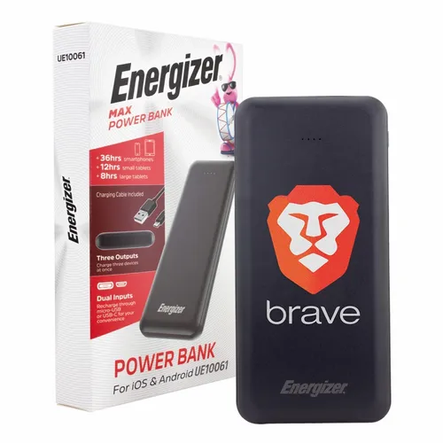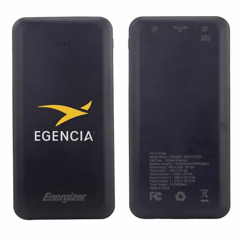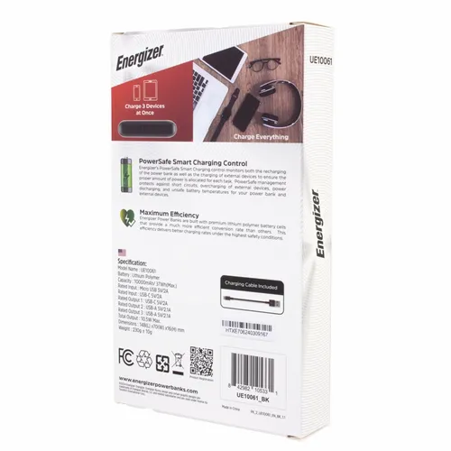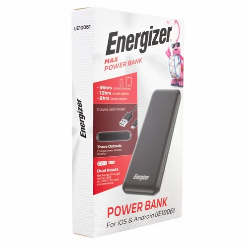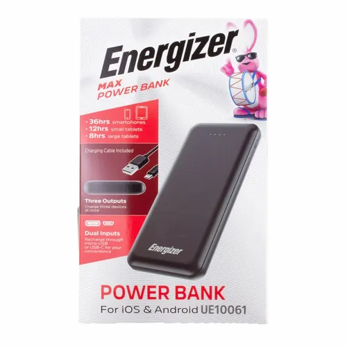 A great looking Energizer power bank with 10,000 mAh battery capacity. It's a great device for daily use for any busy professional. Specifications: Model Name: UE10061/ Cell Type: Lithium Polymer/ Battery Capacity: 10000 mAh/37Wh(Max.)/ Rated Input: Micro USB 5V=2A/ Rated Input: USB-C 5V=2A/ Rated Output 1: USB-C 5V=2A/ Rated Output 2: USB-A 5V=2.1A/ Rated Output 3: USB-A 5V=2.1A/ Total Output: 10.5W(Max.)