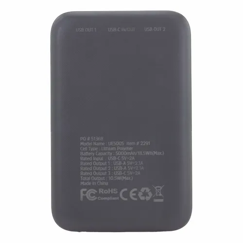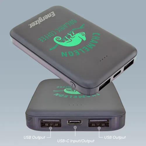 A great looking Energizer power bank with 5,000 mAh battery capacity. It's a great device for daily use for any busy professional. Specifications: Model 'Name: UE5005/ Cell Type: Lithium Polymer/ Battery-Capacity: 5OOO mAh/18.5Wh(Max.)/ Rated Input: USB-C 5V=2A/ Rated Output 1: USB-A 5V=2.1A/ Rated Output 2: USB-A 5V=2.1A/ Rated Output 3: USB-C 5V=2A/ Total Output: 10.5W(Max.)