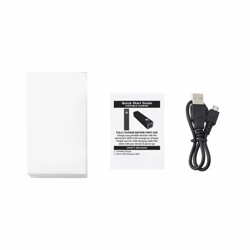 This metal portable USB charger features a 2200 mAH battery and one USB charging port. Perfect for Smart Phones, and more! Charge your Smartphone more than 90% with this portable charger. Features: • 2200 mAH battery, Battery Cell inside the charger is UL listed • On / Off Button • Battery Test Button • 1 x USB Charging Port Includes: • Portable Charger • Micro USB Charging Cable • Quick Start Guide • White Tuck Box Packaging