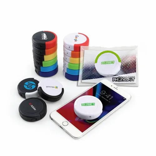 Tired of smudges and dust on your touch screens? Let PhoneBot do the dirty work! Simply switch PhoneBot on and place on your device screen. It will move across your screen wiping it clean. * To thoroughly clean screen, add pressure with finger and guide the unit across the screen. This fun gadget is equipped with replaceable CR2032 battery, a built in microfiber pad for cleaning, a variety of color trims, a full color imprintable body, and marketing card packaging!