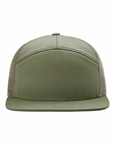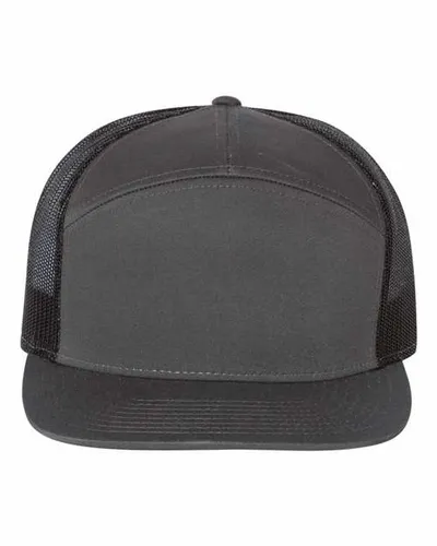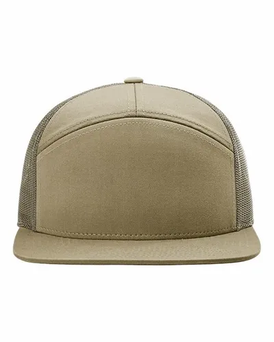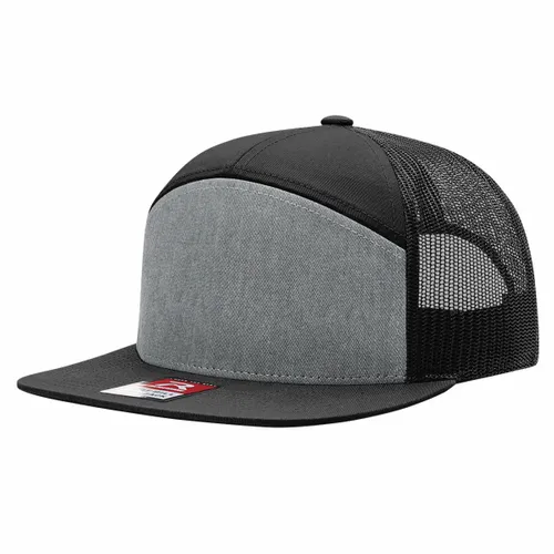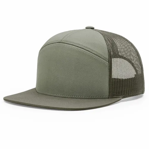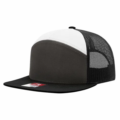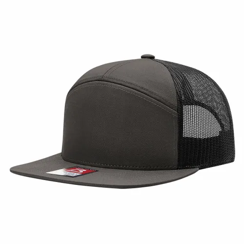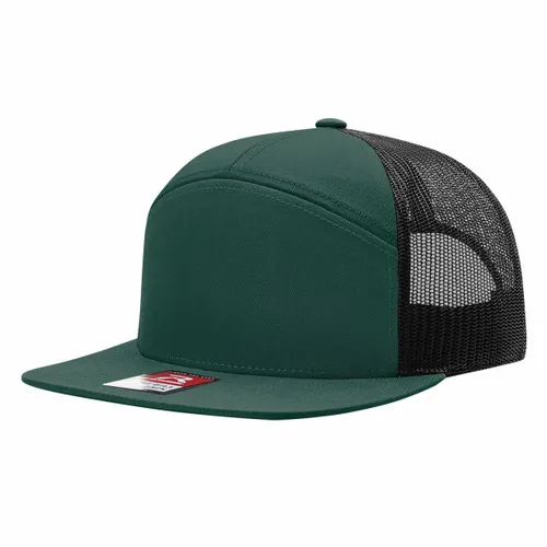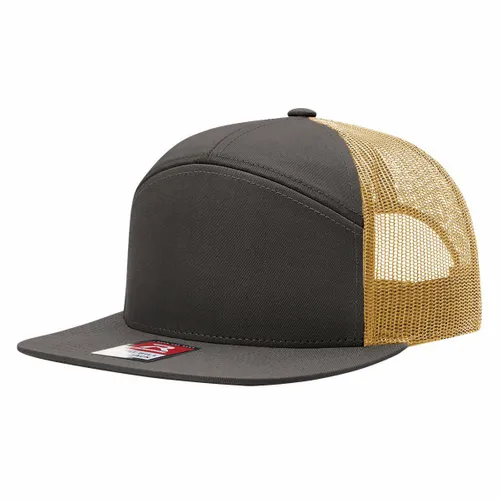 Front: 60% Cotton/40% Polyester Back: 100% Polyester Cotton/Polyester Twill Fabric, Trucker Mesh Structured, Seven-panel, Hi Pro profile Flat Bill Adjustable Snapback Closure